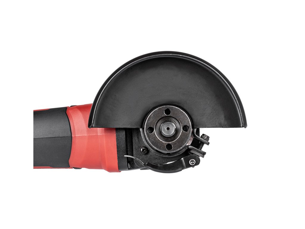 - Brúska je vybavená ochranným krytom s rýchloupínacím mechanizmom, ktorý umožňuje rýchle prestavenie bez použitia náradia. Pomocnú bočnú rukoväť možno pripevniť v troch rôznych polohách, čo zvyšuje komfort a presnosť práce. Prístroj je osadený 125mm kotúčom a disponuje závitom M14, kompatibilným so štandardnými kotúčmi.
