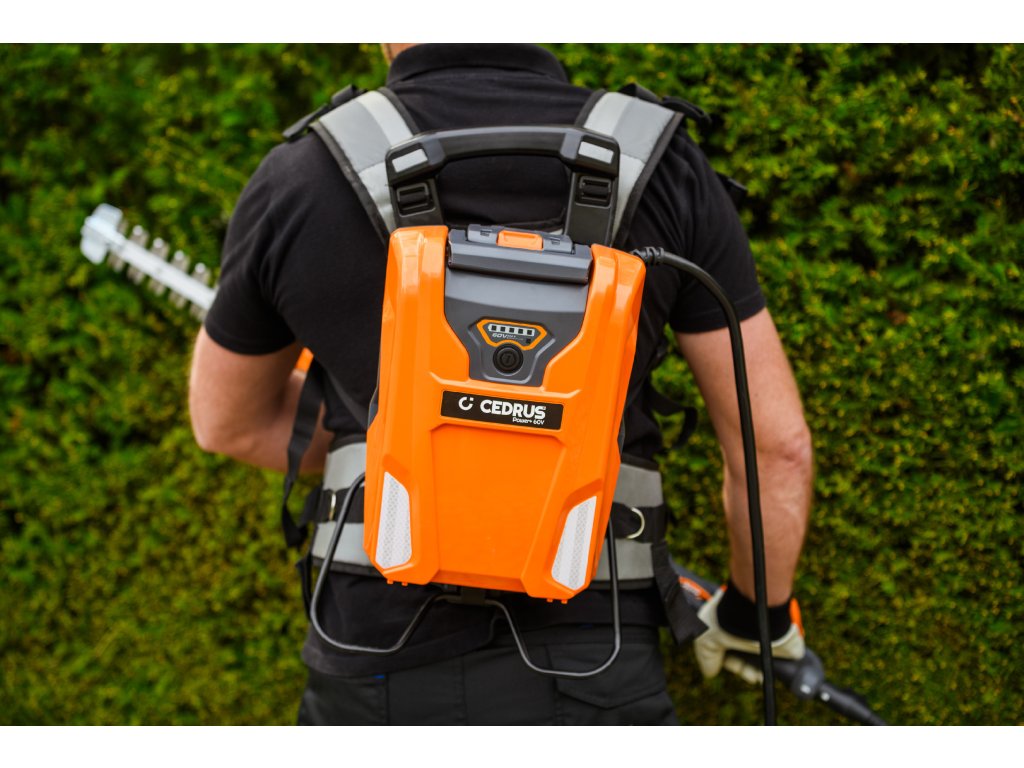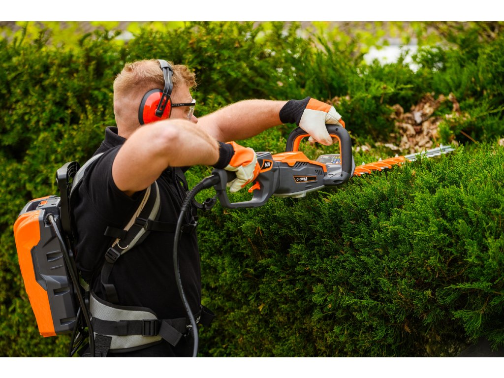 Výkonné bezdrôtové nožnice na živý plot Cedrus HT640-P so silným bezuhlíkovým motorom 1200 W, dlhým obojstranným laserom rezaným nožom a zvýšenou mobilitou vďaka napájaniu Plug-In. Vhodné na presné strihanie konárov až do 30 mm v priemere.