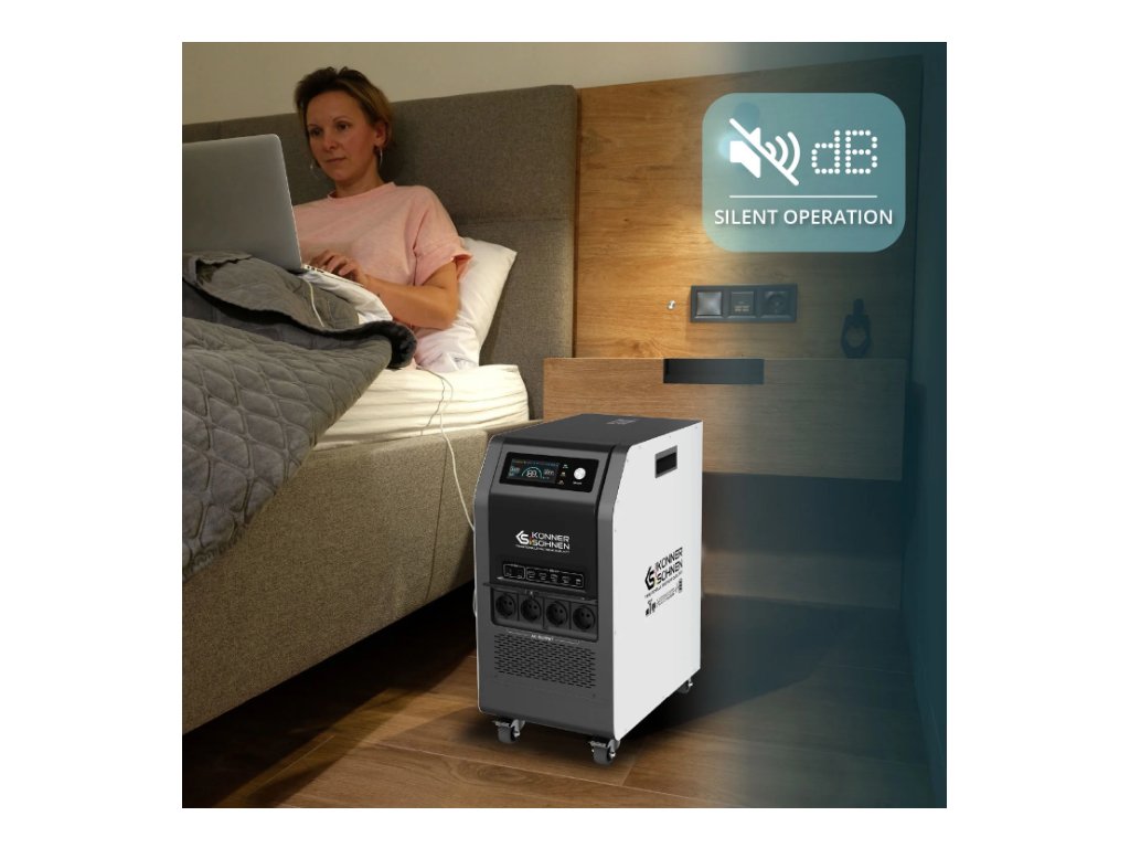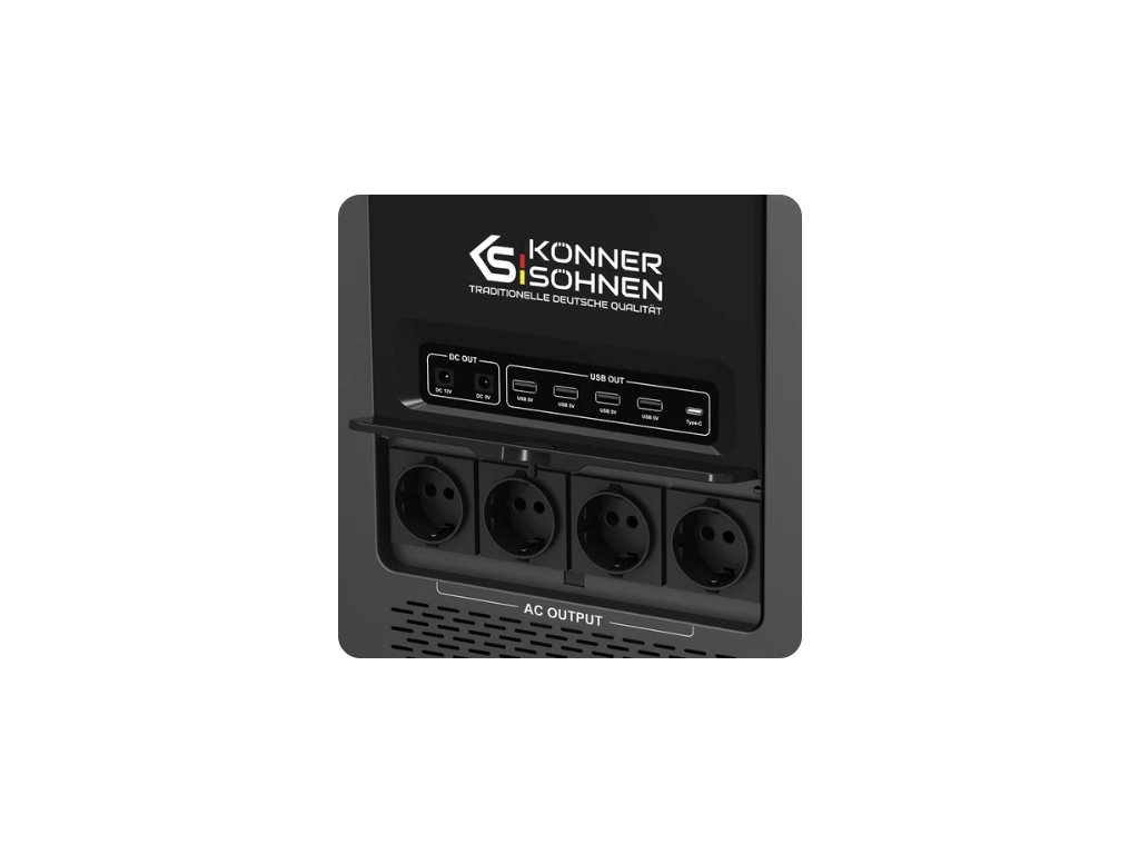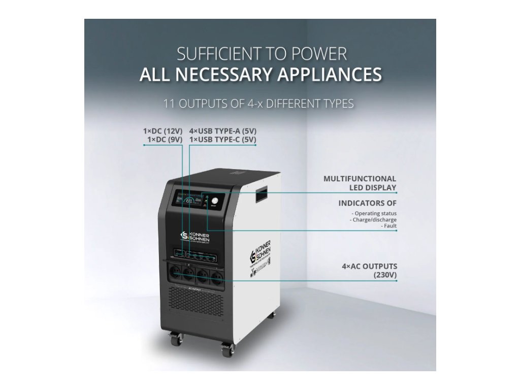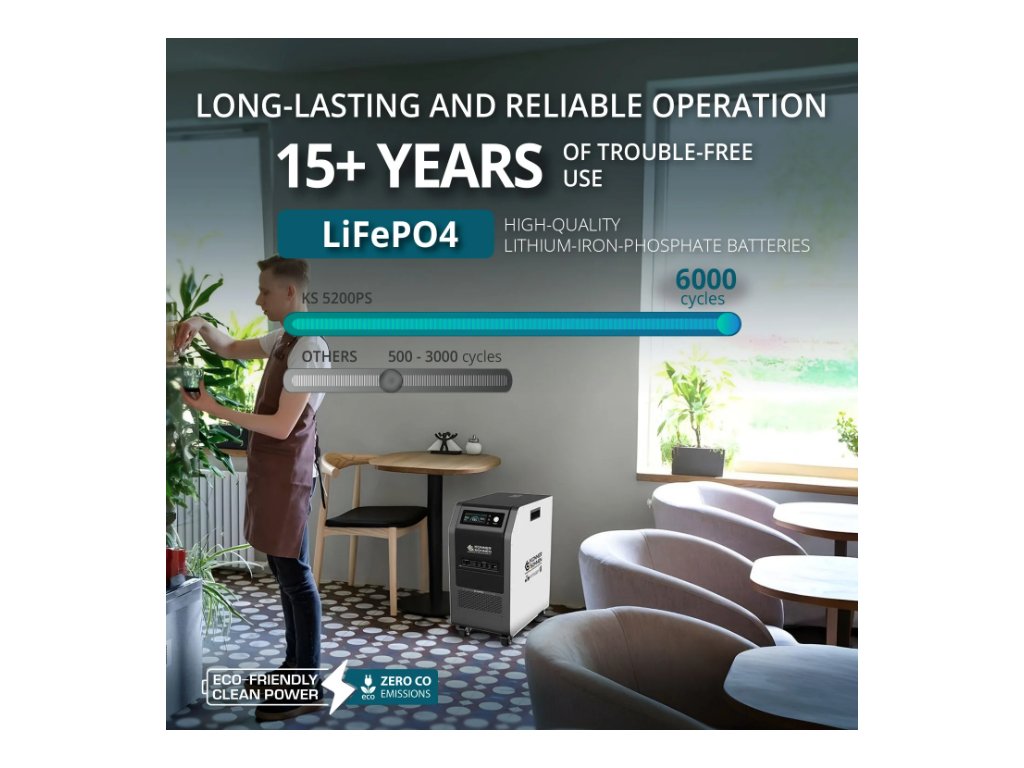 - S intuitívnym LCD displejom, 11 portami vrátane 4× AC zásuviek, USB-A, USB-C a DC výstupov a minimálnou údržbou, je KS 5200PS ideálnym riešením pre náročných používateľov. Je vybavená kolieskami a držadlami pre jednoduchý transport. Vďaka tichej prevádzke bez emisií je skvelá pre ekologicky šetrné použitie v prírode alebo obytných priestoroch.