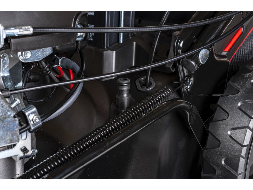 - Systém čistenia: Integrovaný čistiaci systém pre ľahké a rýchle čistenie podvozku a nožov kosačky, čo pomáha udržať optimálny výkon a predĺžiť životnosť stroja.