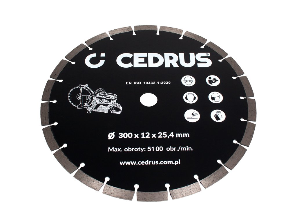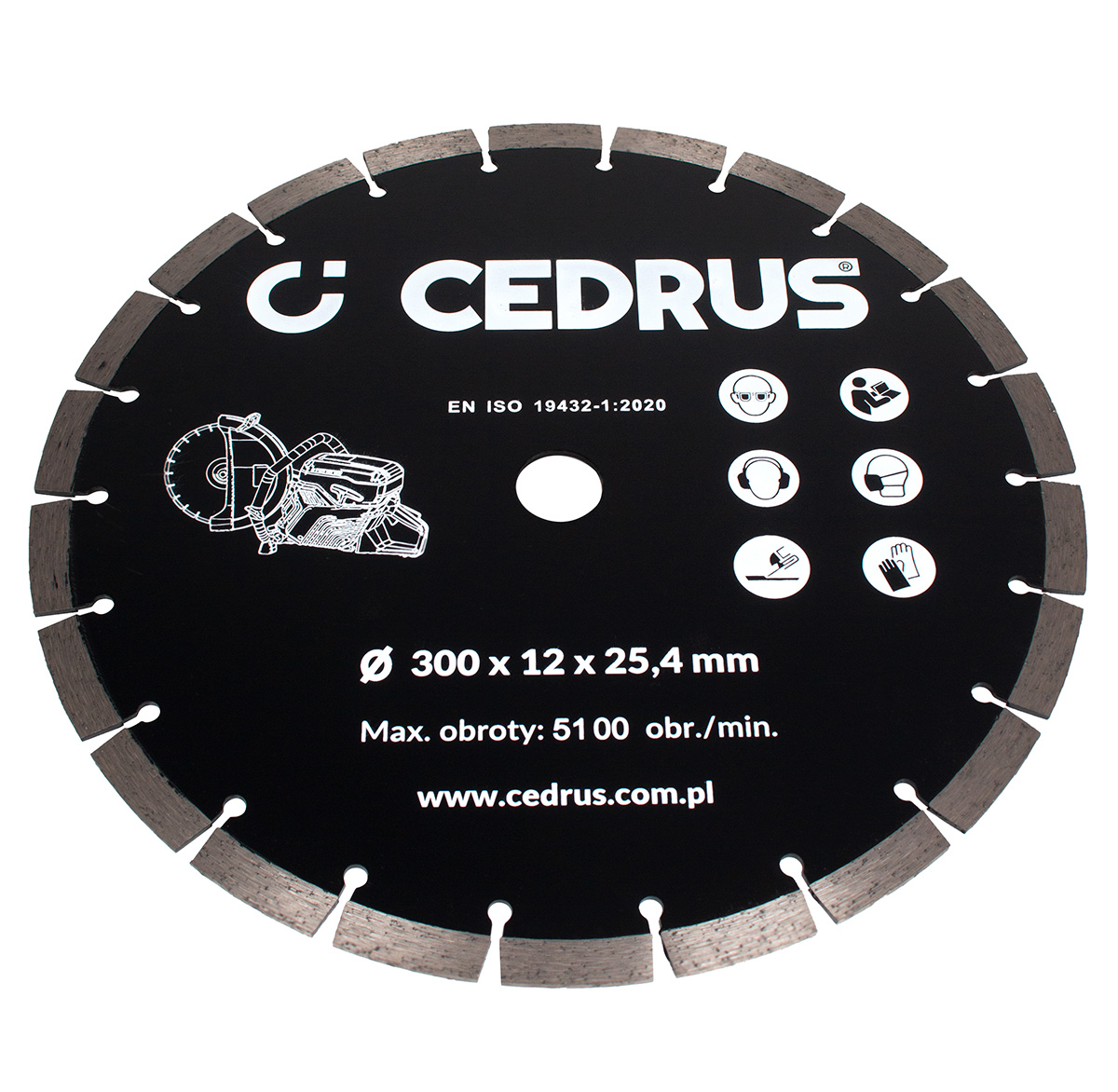 Profesionálny diamantový kotúč Cedrus určený pre benzínovú rozbrusovačku CEDPC300. Umožňuje efektívne rezanie tvrdých stavebných materiálov, ako sú betón, kameň, tehly či obrubníky. Optimalizovaný pre vysoký výkon a dlhú životnosť.