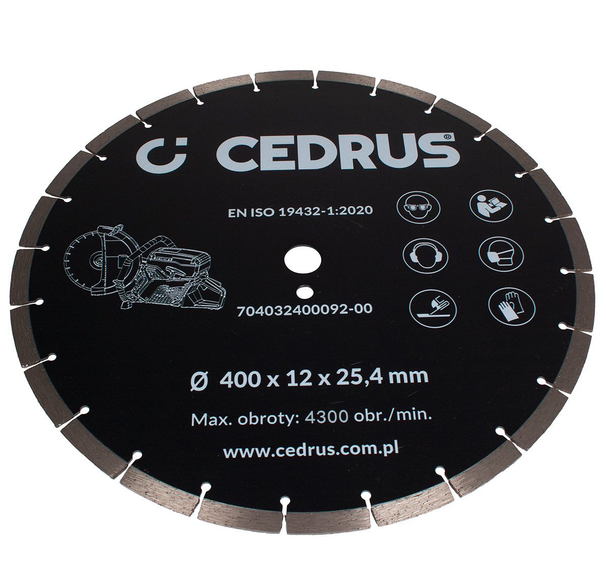 Tento vysoko kvalitný diamantový rezný kotúč je určený pre rozbrusovaciu pílu Cedrus CEDPC400-94, ktorá sa vyznačuje vysokým výkonom a spoľahlivosťou pri rezaní tvrdých stavebných materiálov. Kotúč má vonkajší priemer 400 mm, upínací otvor 25,4 mm a je navrhnutý pre vysoké otáčky typické pre spaľovacie rozbrusovačky.