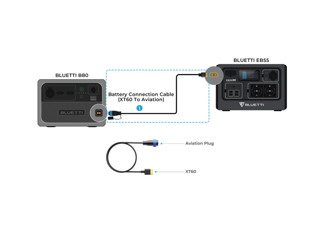 Prepojovací kábel B80-AVIATION PLUG P120D to XT60 je určený na pripojenie rozširujúcej batérie B80 k vybraným modelom prenosných staníc Bluetti – konkrétne EB55, AC2A, AC70 a AC50B.