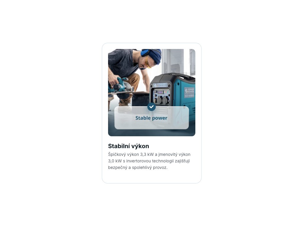 - Špičkový výkon 3,3 kW / menovitý 3,0 kW – stabilné napájanie spotrebičov a náradia