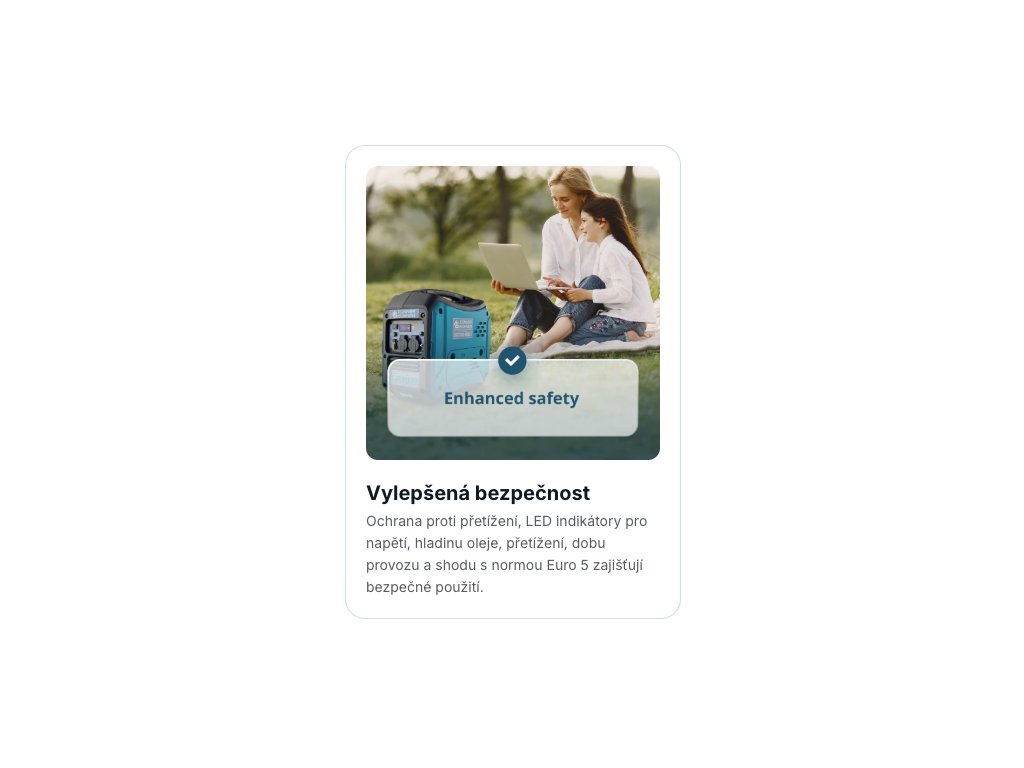 - Tichá prevádzka ~68 dB vo vzdialenosti 7 m – ideálna pre kempovanie a obytné oblasti