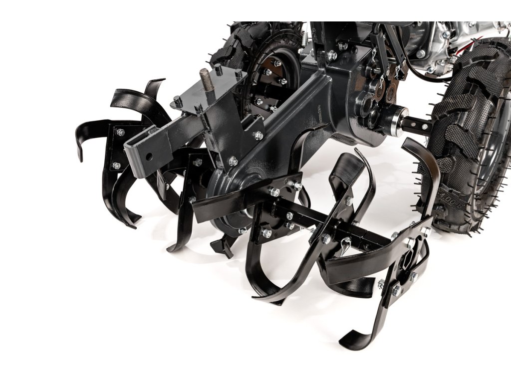 - Kultivátor je vybavený oceľovými nožmi s vysokou odolnosťou, ktoré dosahujú pracovnú hĺbku až 20 cm a šírku 65 cm. Vďaka veľkým kolesám (4,00-8) má výbornú stabilitu a ľahko sa ovláda aj v členitom teréne. Prevodovka s kapacitou 2,5 litra oleja zaručuje dlhú životnosť a spoľahlivý prenos sily.