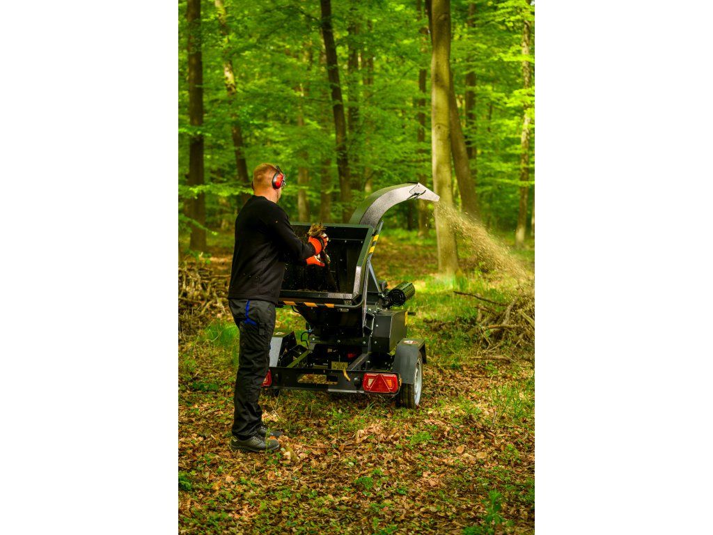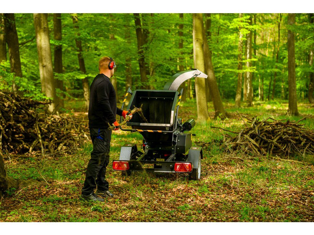 - Drviaci bubon s dvoma obojstrannými nožmi a jednou pevne uloženou kovadlinou sa otáča rýchlosťou až 2200 ot./min, pričom štiepkovač si poradí s konármi do priemeru 130 mm. Materiál je podávaný samospádom (gravitáciou) bez potreby hydraulického vkladania, čo znižuje prevádzkovú náročnosť.