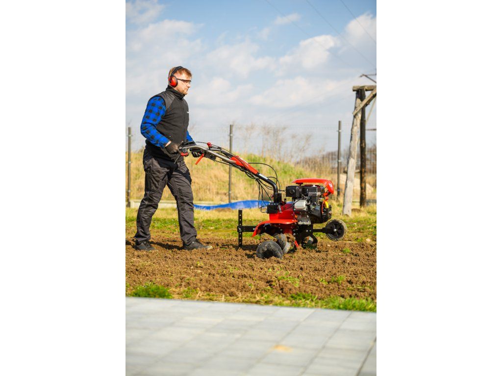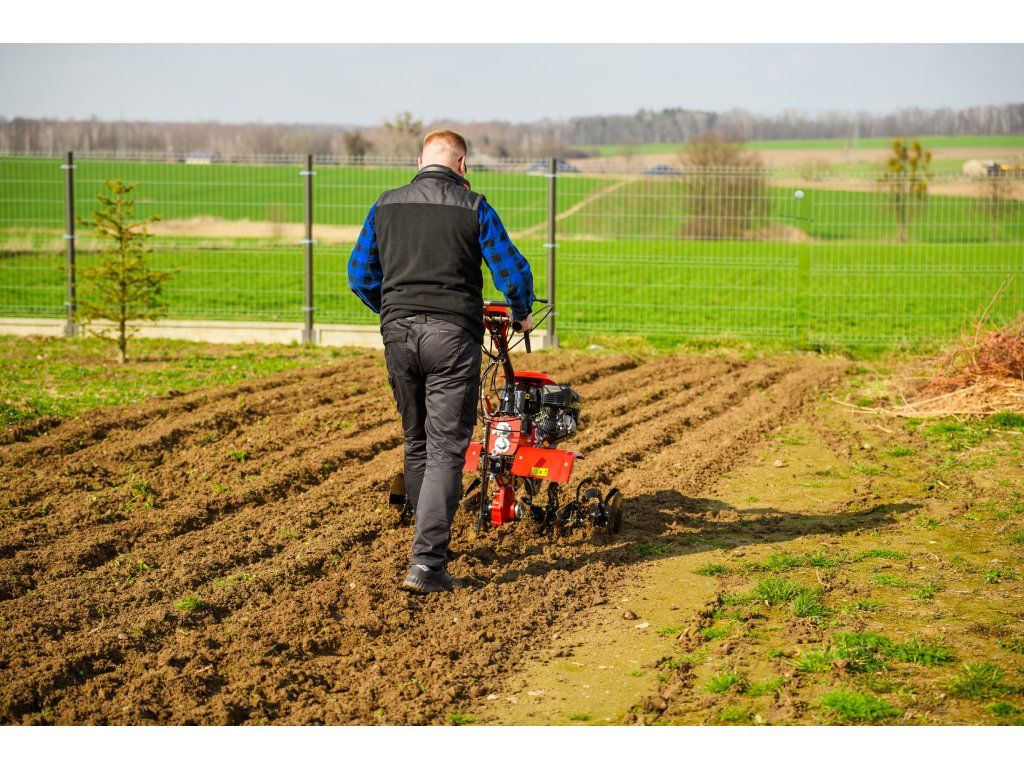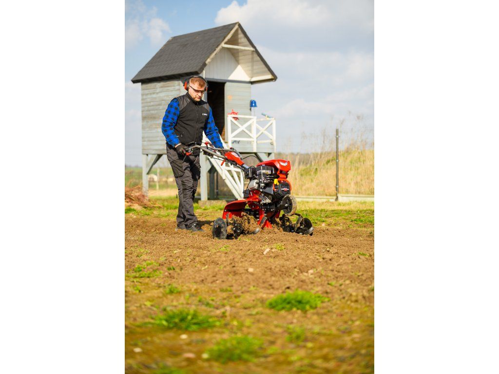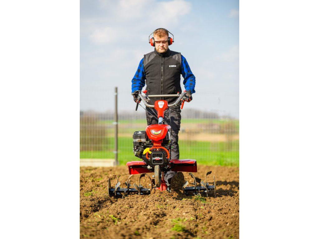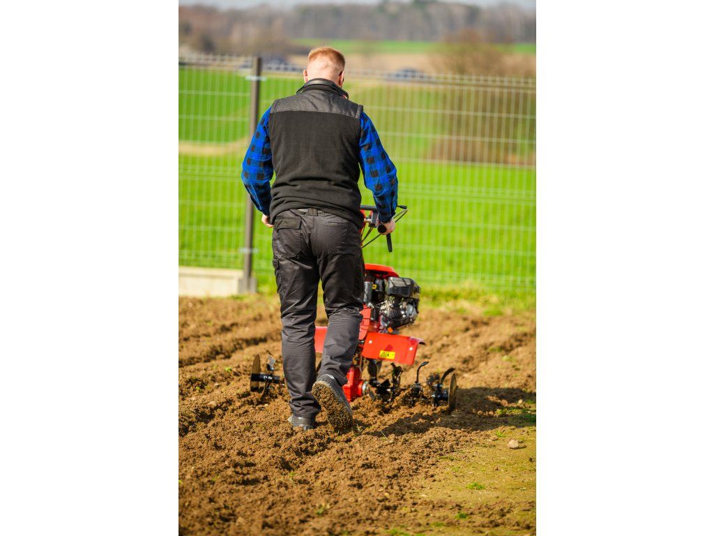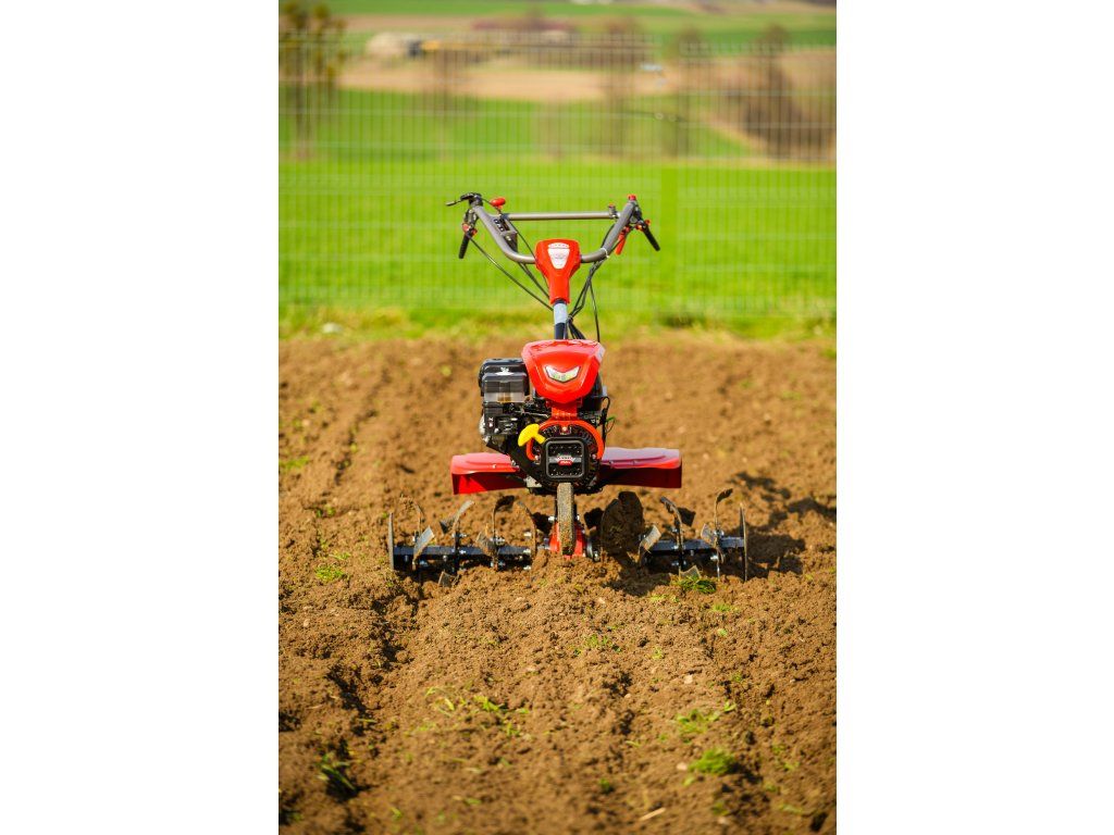 - Pracovná šírka 103 cm a hĺbka do 180 mm umožňujú rýchle a efektívne spracovanie rozsiahlych záhonov, polí alebo sadov. Stroj disponuje 2 rýchlosťami vpred a 1 vzad, ktoré zabezpečujú optimálnu ovládateľnosť. Vďaka silnej prevodovke s objemom oleja 2,2 litra a 8 pracovným nožom (4+4) je zaručená dlhá životnosť a výborný výkon aj v tvrdej pôde.