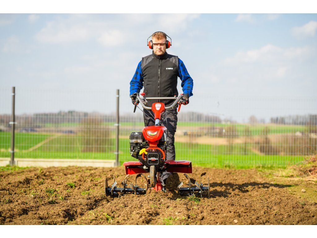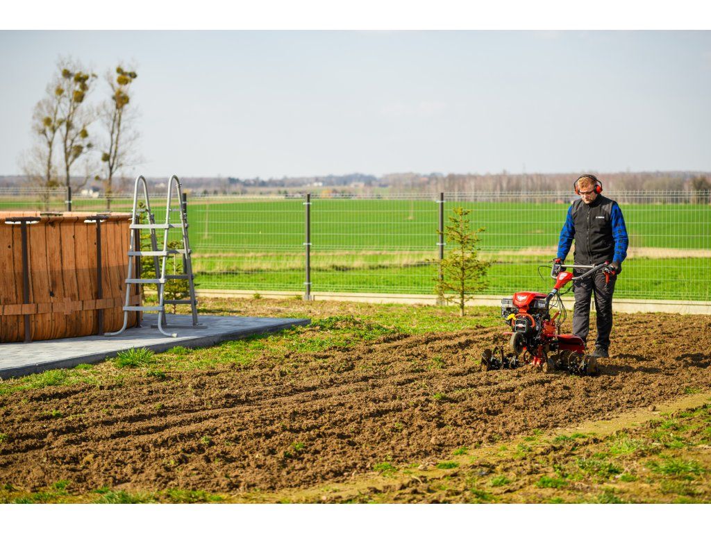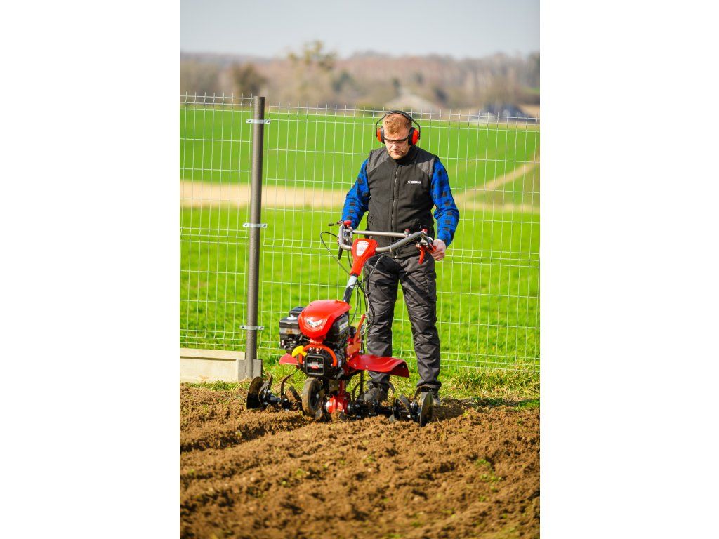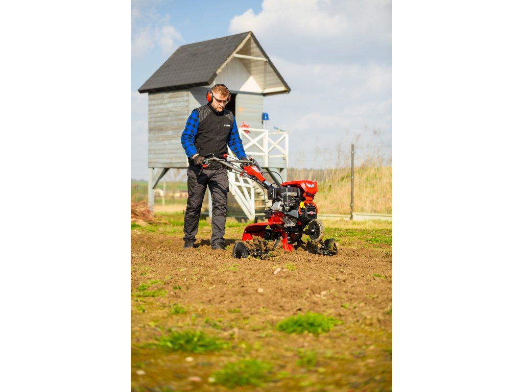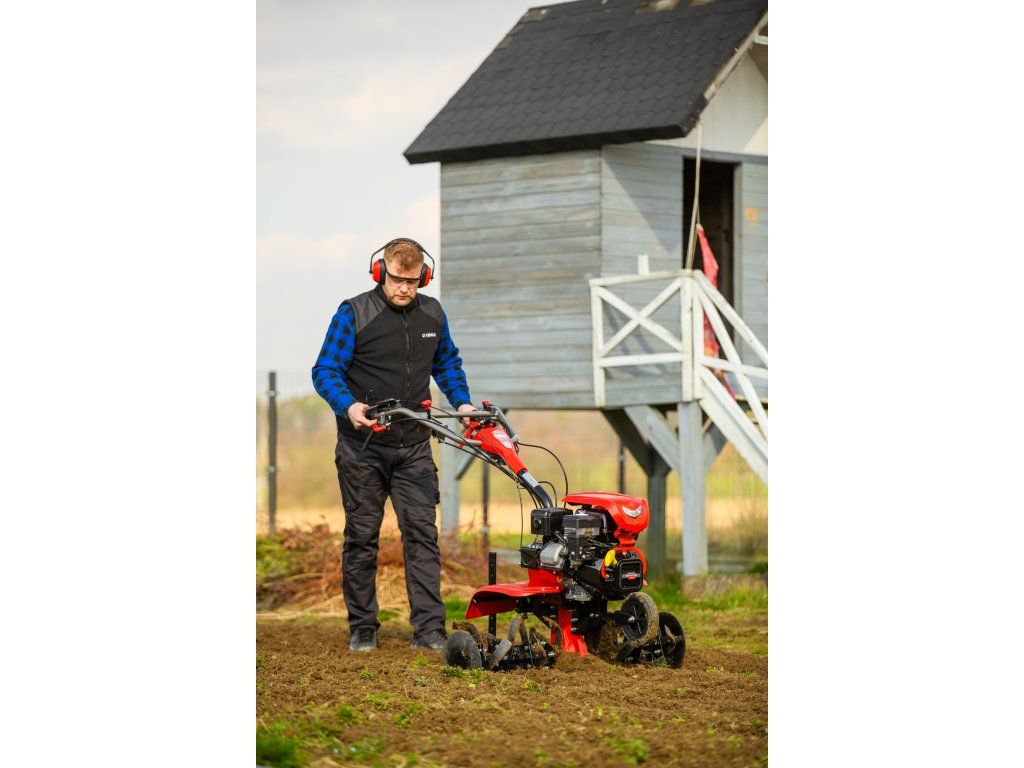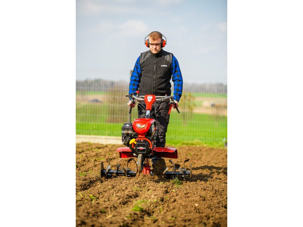 - Pracovná šírka 103 cm a hĺbka do 180 mm umožňujú rýchle a efektívne spracovanie rozsiahlych záhonov, polí alebo sadov. Stroj disponuje 2 rýchlosťami vpred a 1 vzad, ktoré zabezpečujú optimálnu ovládateľnosť. Vďaka silnej prevodovke s objemom oleja 2,2 litra a 8 pracovným nožom (4+4) je zaručená dlhá životnosť a výborný výkon aj v tvrdej pôde.