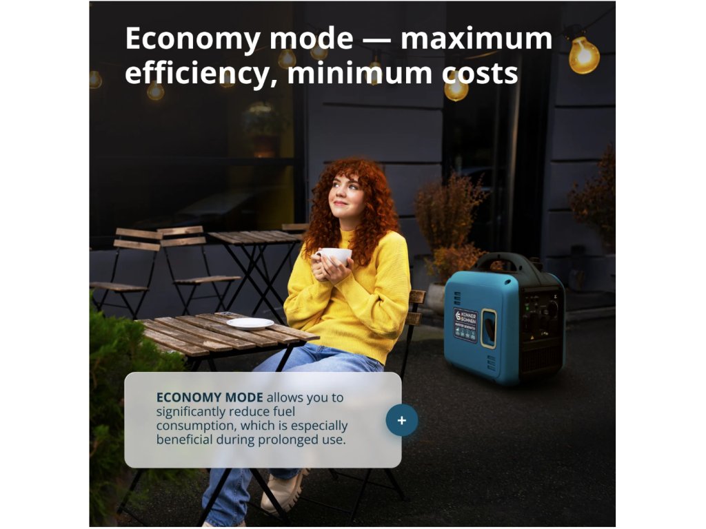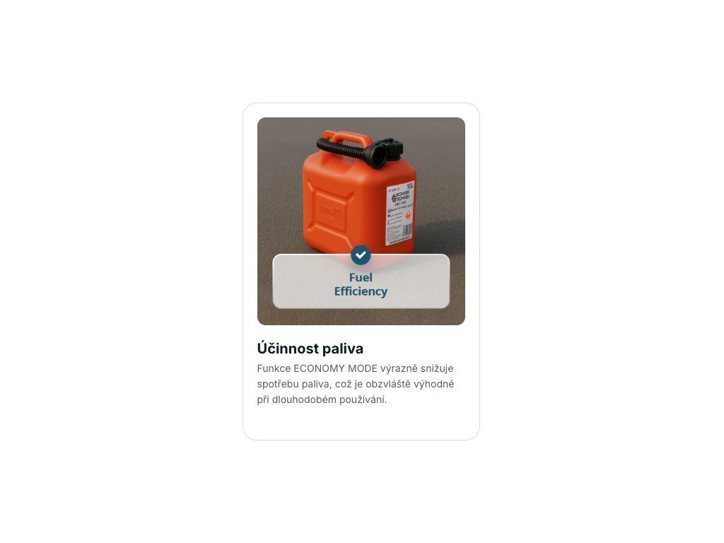 - Vďaka funkcii ECONOMY MODE sa otáčky motora automaticky prispôsobujú aktuálnemu zaťaženiu, čo zvyšuje účinnosť a znižuje spotrebu benzínu — pri polovičnom zaťažení pracuje až 4,5 hodiny na jednu nádrž (4 l).