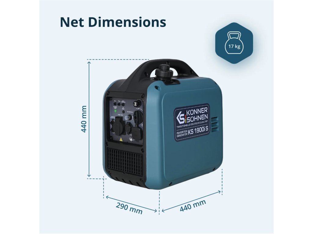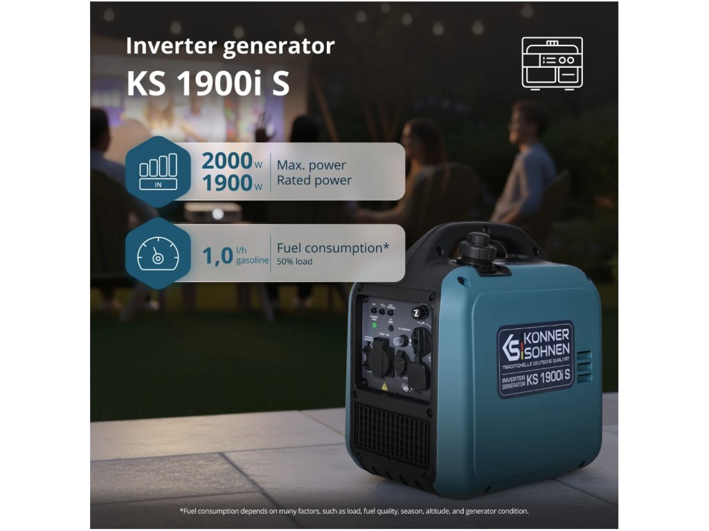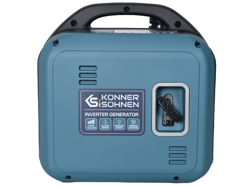 Könner & Söhnen KS 1900i S je moderná invertorová elektrocentrála s maximálnym výkonom 2,0 kW a menovitým 1,9 kW, vybavená mikroprocesorovým invertorom, ktorý zabezpečuje čistý a stabilný výstup pre citlivé spotrebiče — notebooky, televízory, navigácie či lekárske zariadenia.