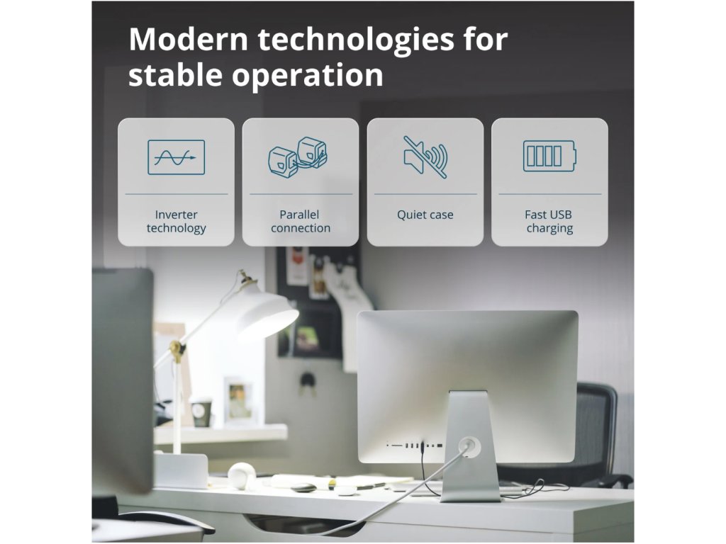 - Centrála má USB porty (QC 3.0 a Type-C) pre rýchle nabíjanie mobilných zariadení a možnosť paralelného prepojenia dvoch jednotiek, čím sa zdvojnásobí výkon.