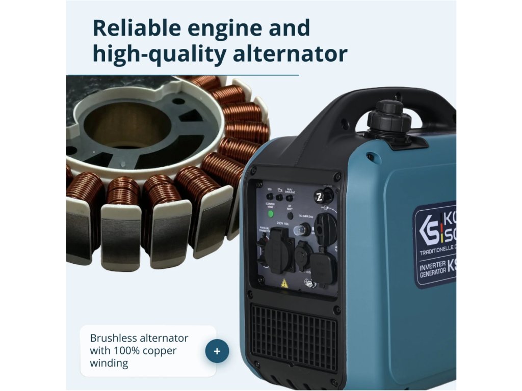 - Vďaka 100 % medenému vinutiu alternátora a bezkefovej konštrukcii ponúka KS 1900i S spoľahlivý výkon a dlhú životnosť aj pri dlhodobom používaní.