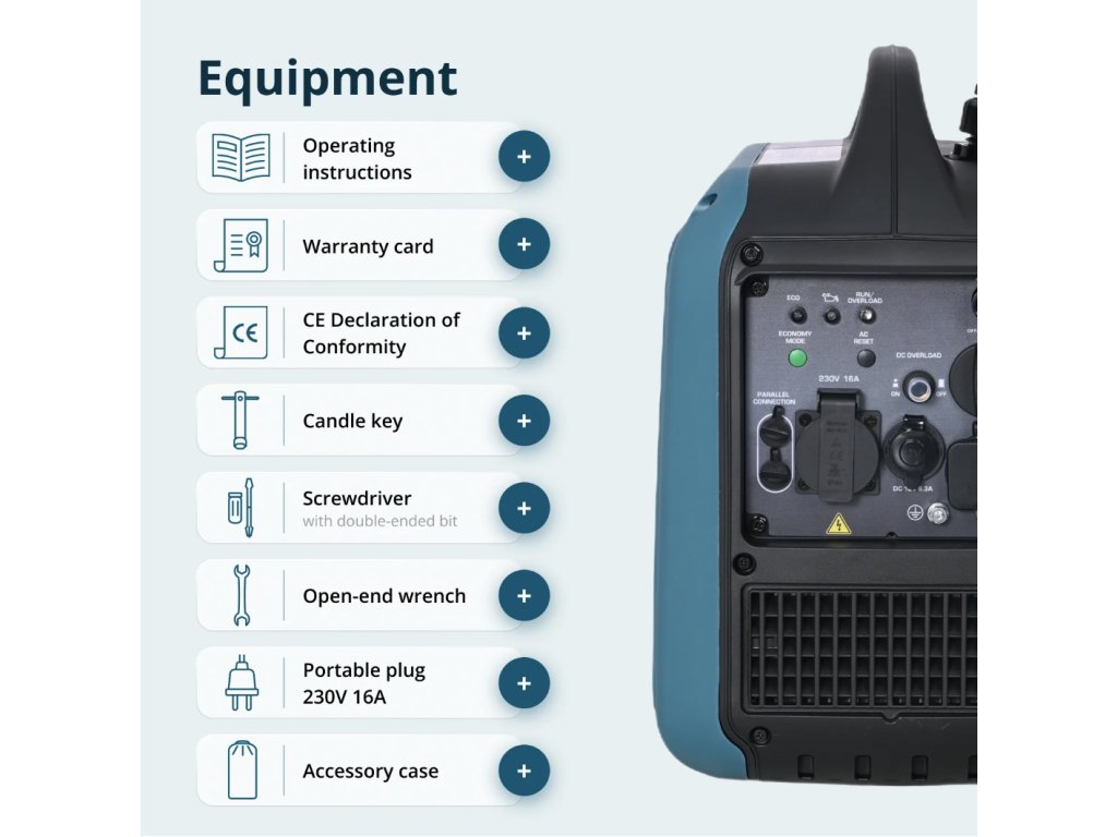 - Zvukotesný kryt zaručuje tichú prevádzku (72 dB vo vzdialenosti 7 m) a kompaktné rozmery 440 × 290 × 440 mm umožňujú jednoduché prenášanie aj uloženie.