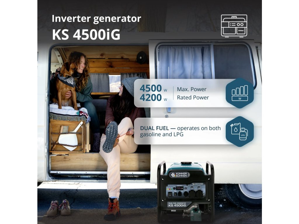 Dvojpalivový invertorový generátor Könner & Söhnen KS 4500iG je výkonný a úsporný zdroj energie ideálny pre domácnosti, podnikanie aj profesionálne použitie. Vďaka invertorovej technológii poskytuje stabilné a bezpečné napätie 230 V / 50 Hz, vhodné aj pre citlivú elektroniku (počítače, meracia technika, zdravotnícke vybavenie, servery).
