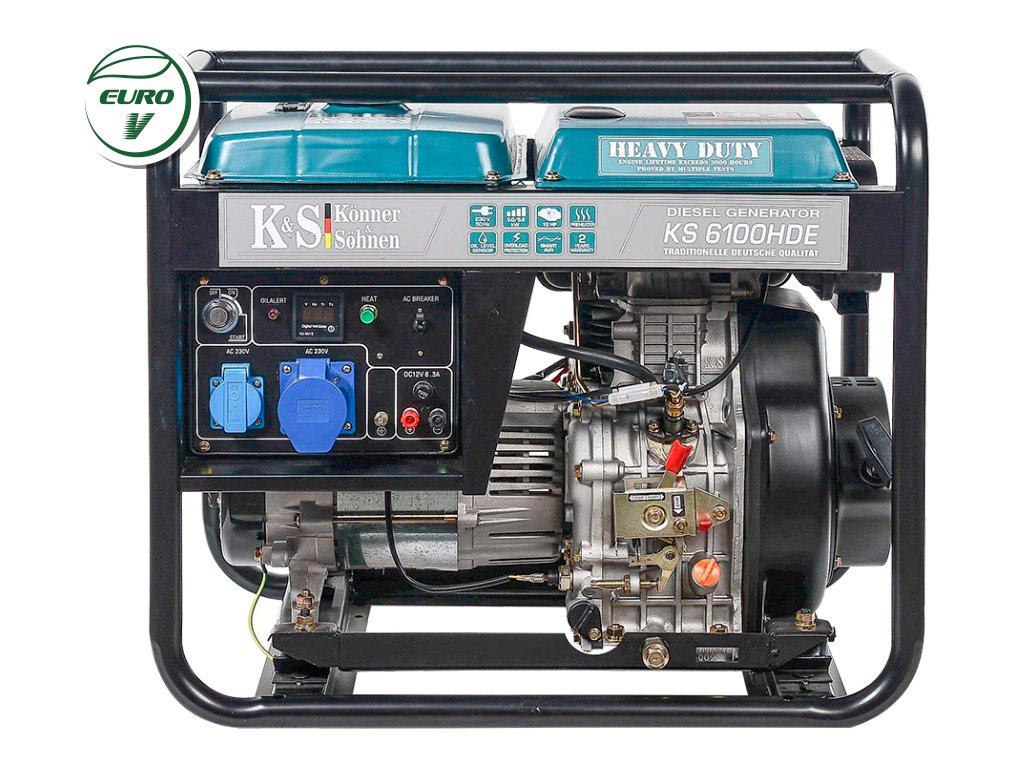 KS 6100HDE (EURO V) je výkonná naftová elektrocentrála radu HEAVY DUTY, ktorá sa pýši robustnou zosilnenou konštrukciou, ktorá chráni nádrž pred poškodením aj počas prepravy. Je vybavená výkonným značkovým motorom Könner & Söhnen, ktorý je možné použiť nielen ako záložný zdroj energie, ale aj na nepretržitú prevádzku. Okrem iného je elektrocentrála vybavená predohrevom, ktorý umožňuje jednoduché spustenie elektrocentrály aj v zime. Inteligentný stabilizačný systém AVR umožňuje udržiavať konštantné napätie 230 V a chráni tak elektrocentrálu pred nežiaducimi skratmi.
