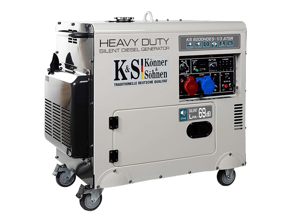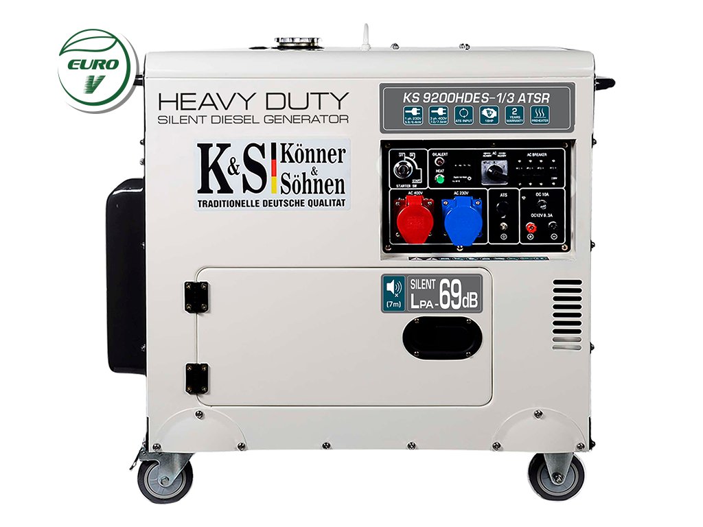 KS 9200HDES-1/3 ATSR je výkonný dieselový elektrický generátor radu HEAVY DUTY SILENT, ktorý sa môže pochváliť robustným celoročným krytom, ktorý tlmí hluk a je odolný voči vonkajšiemu poškodeniu. Tým sa zabezpečí účinná ochrana napájacieho bloku a predĺži sa jeho životnosť. Skriňa je vybavená rukoväťami a kolieskami na jednoduché premiestňovanie napájacieho bloku. Je vybavený výkonným motorom značky Könner & Söhnen, ktorý možno použiť nielen ako záložný zdroj energie, ale aj na nepretržitú prevádzku. Elektráreň je okrem iného vybavená predhrievačom, ktorý uľahčuje spustenie elektrárne aj v zime. Tento model je tiež vybavený systémom prepínania fáz VTS, vďaka ktorému nie je potrebné kupovať dve samostatné napájacie jednotky. Tento systém môže ľahko prepínať medzi 230 V (jednofázový režim) a 400 V (trojfázový režim).