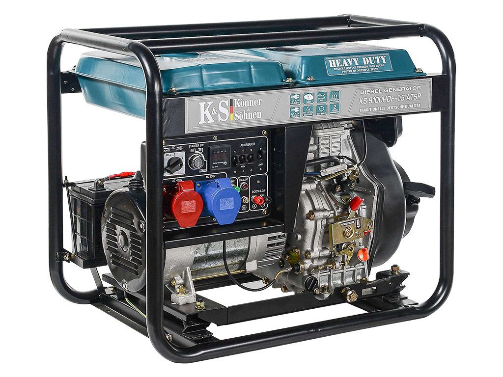KS 9100HDE 1/3 ATSR (EURO V) je výkonná naftová elektrocentrála řady HEAVY DUTY, která se pyšní robustní zesílenou konstrukcí, jež chrání nádrž před poškozením i během přepravy. Je vybavena výkonným značkovým motorem Könner & Söhnen, který lze použít nejen jako záložní zdroj energie, ale i k nepřetržitému provozu. Mimo jiné je elektrocentrála vybavena předehřívačem, který umožňuje snadné spuštění elektrocentrály i v zimě. Inteligentní stabilizační systém AVR umožňuje udržovat konstantní napětí 230 V a chrání tak elektrocentrálu před nežádoucími zkraty. Tento model je navíc vybaven systémem fázového spínání VTS, díky němuž není potřeba kupovat dvě samostatné elektrocentrály. Tento systém dokáže jednoduše přepínat mezi fázemi - 230 V (jednofázový režim) a 400 V (třífázový režim).
