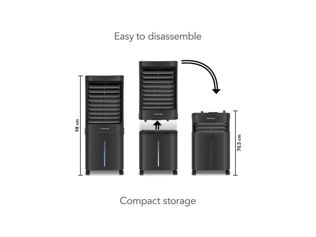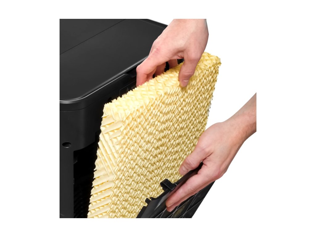 Velká 40litrová nádrž na vodu umožňuje dlouhodobý provoz s odpařovací kapacitou až 2,6 l/h, což zajišťuje příjemné klima v místnostech o velikosti až 72 m². Po skončení sezóny lze zařízení jednoduše zmenšit z výšky 98 cm na kompaktních 70,5 cm pro úsporu místa při skladování.