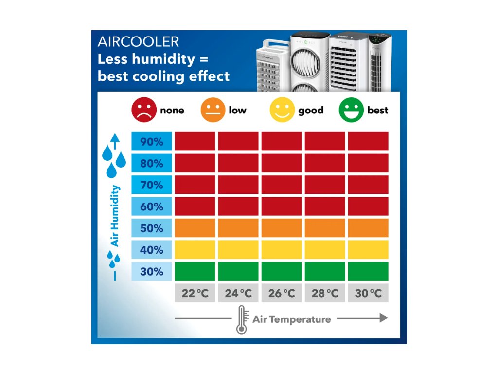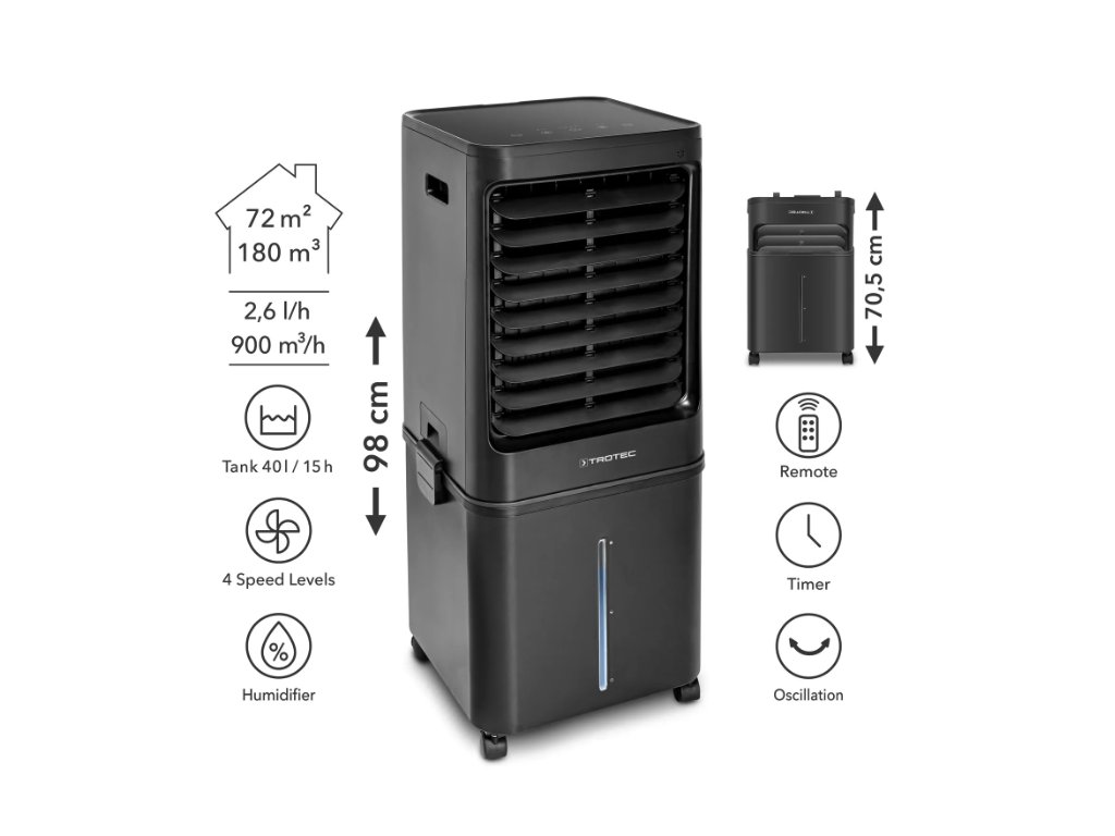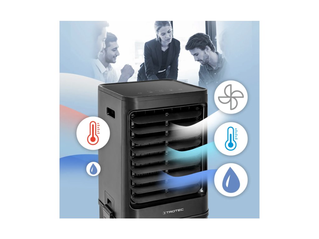 TROTEC Aircooler PAE 60 přináší osvěžení do vašich prostor díky kombinaci čtyř funkcí: chlazení, ventilace, čištění a zvlhčování vzduchu. Díky elegantnímu designu v matné černé barvě se hodí do moderních i klasických interiérů. Zařízení využívá přirozený proces odpařování k ochlazení vzduchu, což představuje ekologické a energeticky úsporné řešení bez použití chemických chladiv.
