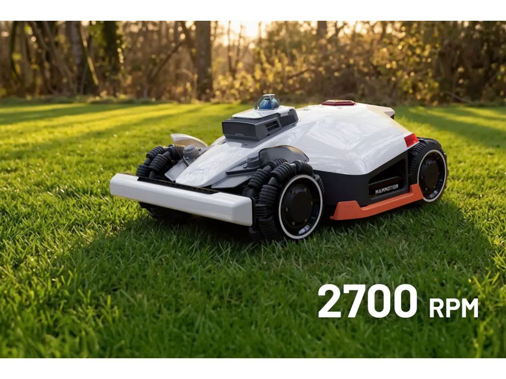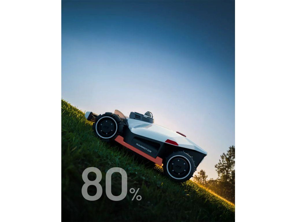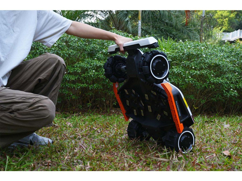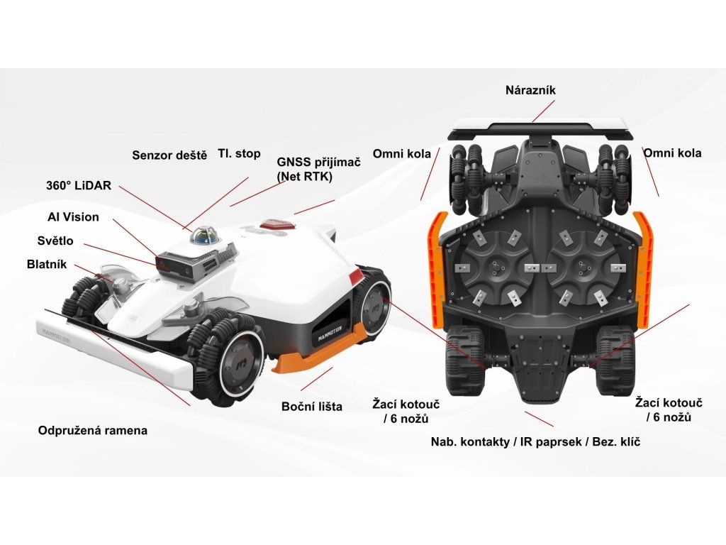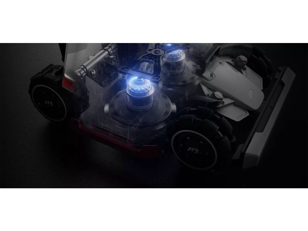 - Vďaka pohonu všetkých kolies (AWD) zvláda extrémny terén vrátane svahov až 80 % a nerovností. Všesmerové kolesá umožňujú plynulé otáčanie na mieste bez poškodenia trávnika, zatiaľ čo odpružené ramená zvládnu prekážky až do výšky 50 mm.