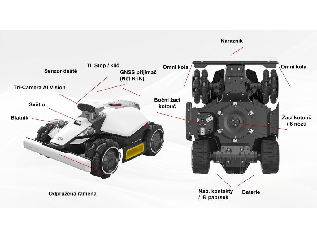 Robotická kosačka pre plochy až 1000 m², ktorá funguje úplne bez obvodového drôtu. Vďaka kombinácii AI Vision s tromi kamerami a NetRTK navigácie si sama vytvorí presnú mapu záhrady a optimalizuje trasu kosenia. Vhodná aj do členitého a svahovitého terénu vďaka pohonu všetkých kolies (AWD).
