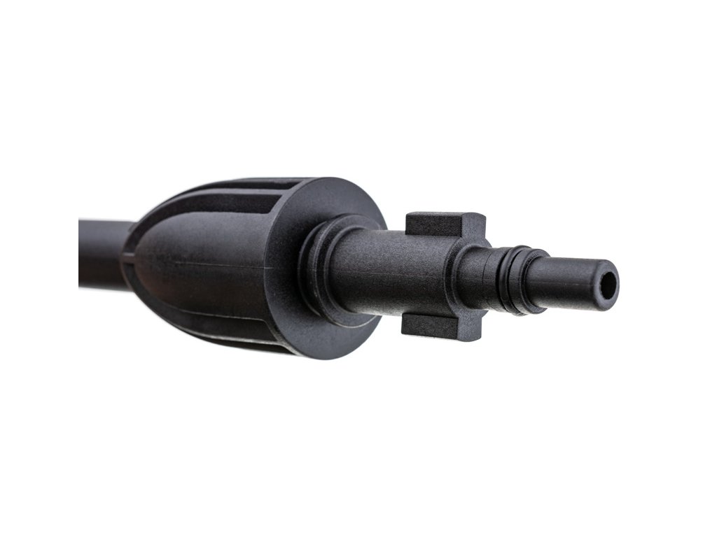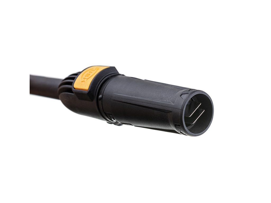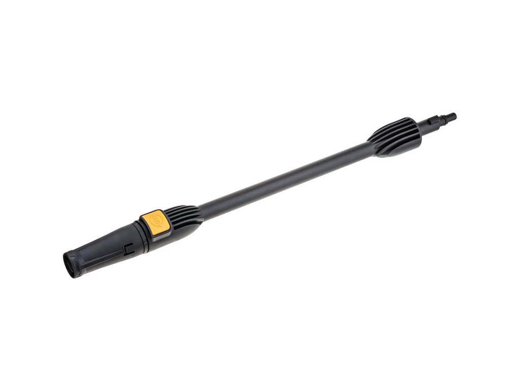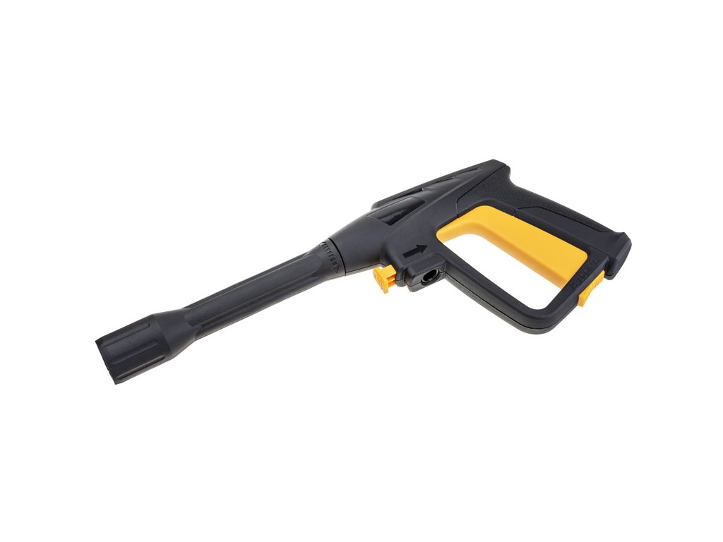 - Pištoľ sa pohodlne drží, má ergonomický tvar a bezpečnostný zámok proti nechcenému spusteniu. Trysku možno jednoducho odmontovať a nahradiť iným príslušenstvom ako je rotačná či penová tryska (nie je súčasťou balenia).