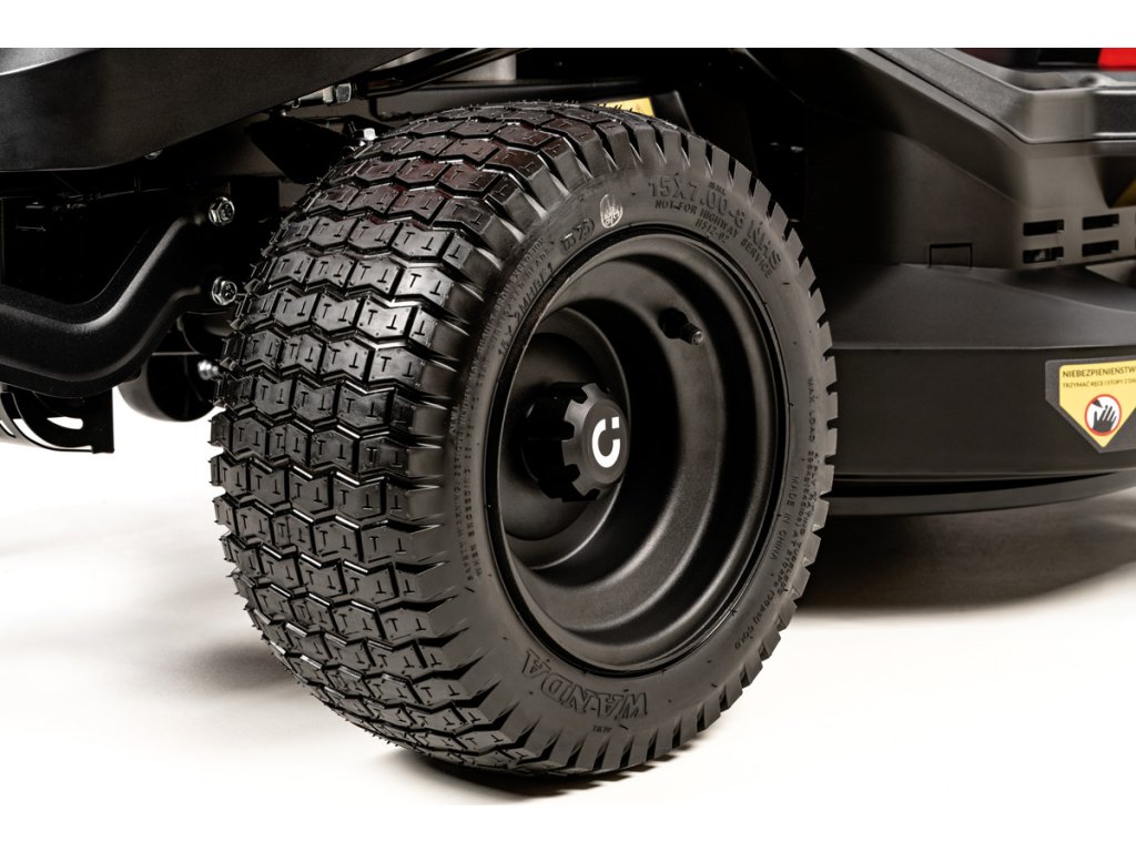 - Traktor je vybavený reflektormi na prácu za zníženej viditeľnosti, pohodlným sedadlom, veľkou palivovou nádržou a mäkkými kolesami 15"/18" pre dobrý záber aj komfortnú jazdu.
