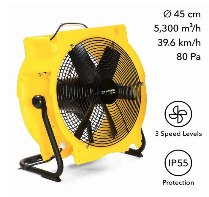 TTV 4500 kombinuje výkonný axiálny ventilátor s možnosťou pripojenia rôznych vzduchových hadíc alebo prachových vakov, čo z neho robí všestranné riešenie pre rôzne ventilačné úlohy. Jeho robustná konštrukcia je navrhnutá pre náročné podmienky, s dlhou životnosťou a spoľahlivosťou aj pri nepretržitej prevádzke. Ventilátor je tiež ideálny na podporu kondenzačných sušičiek pri vysúšaní stavieb vďaka schopnosti veľkoobjemovej cirkulácie vzduchu, čo urýchľuje proces odparovania.