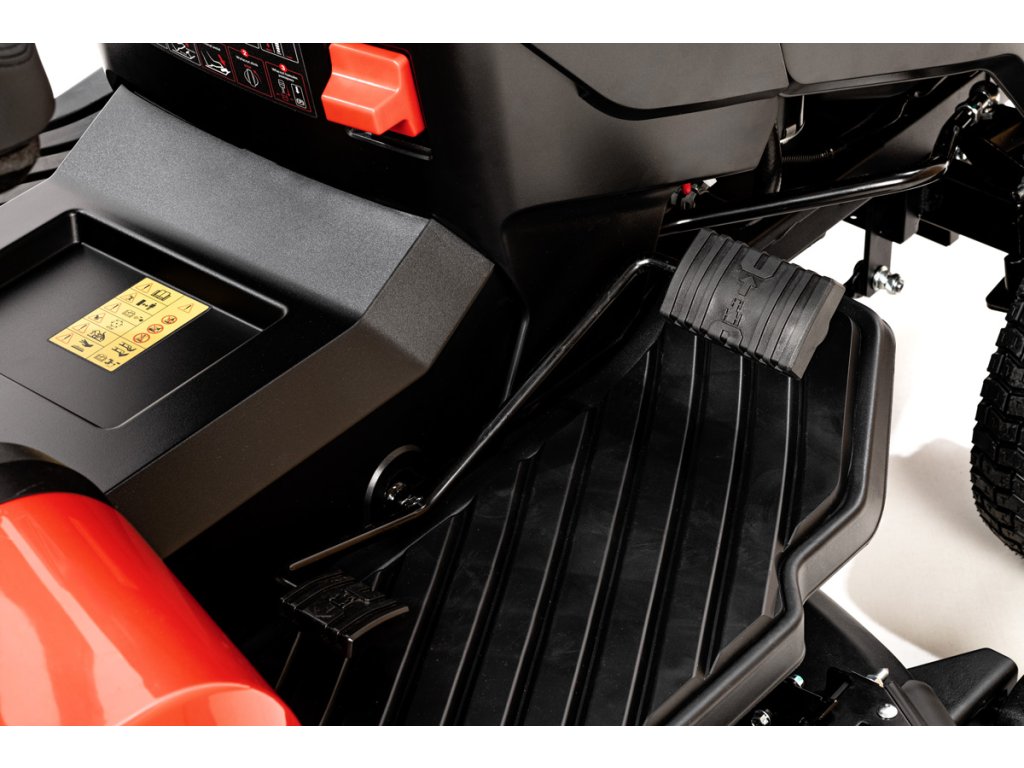 - Hydrostatická prevodovka Tuff Torq, ovládaná pedálom, umožňuje plynulú zmenu rýchlosti vpred aj vzad bez potreby radenia, čo zaisťuje komfortnú jazdu a presné manévrovanie.