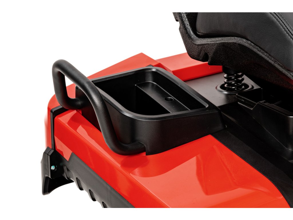 - Vďaka LED svetlám so súmrakovým čidlom je možné pracovať aj pri zhoršenej viditeľnosti. Záves pre príves, držiak na nápoj a úchyty na blatníkoch rozširujú využitie traktora aj mimo samotné kosenie – napríklad pri ťahaní prívesu alebo prevoze materiálu.