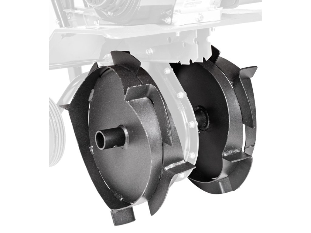 Táto sada obsahuje železné kolesá s plným oceľovým diskom a 6 lopatkami, ktoré zabezpečujú vynikajúci záber v pôde a umožňujú prácu v náročných podmienkach – ako je orba, ryhovanie alebo použitie s plečkou.